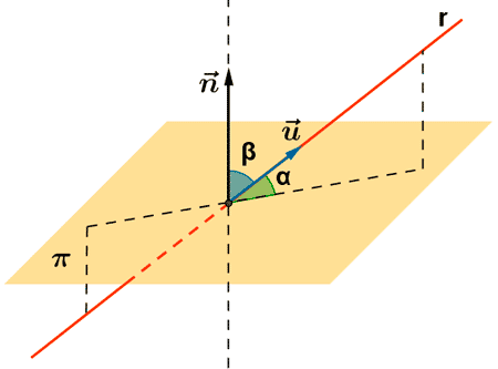 Se a recta é secante ao plano, o ángulo entre unha recta e un plano defínese como o menos ángulo que se determina entre eles, polo que \(0º \leq \widehat{r, \pi} \leq 90º\). Para calculalo, considéranse os vectores \(\vec{v_r}\) e \(\vec{n_\pi}\).
