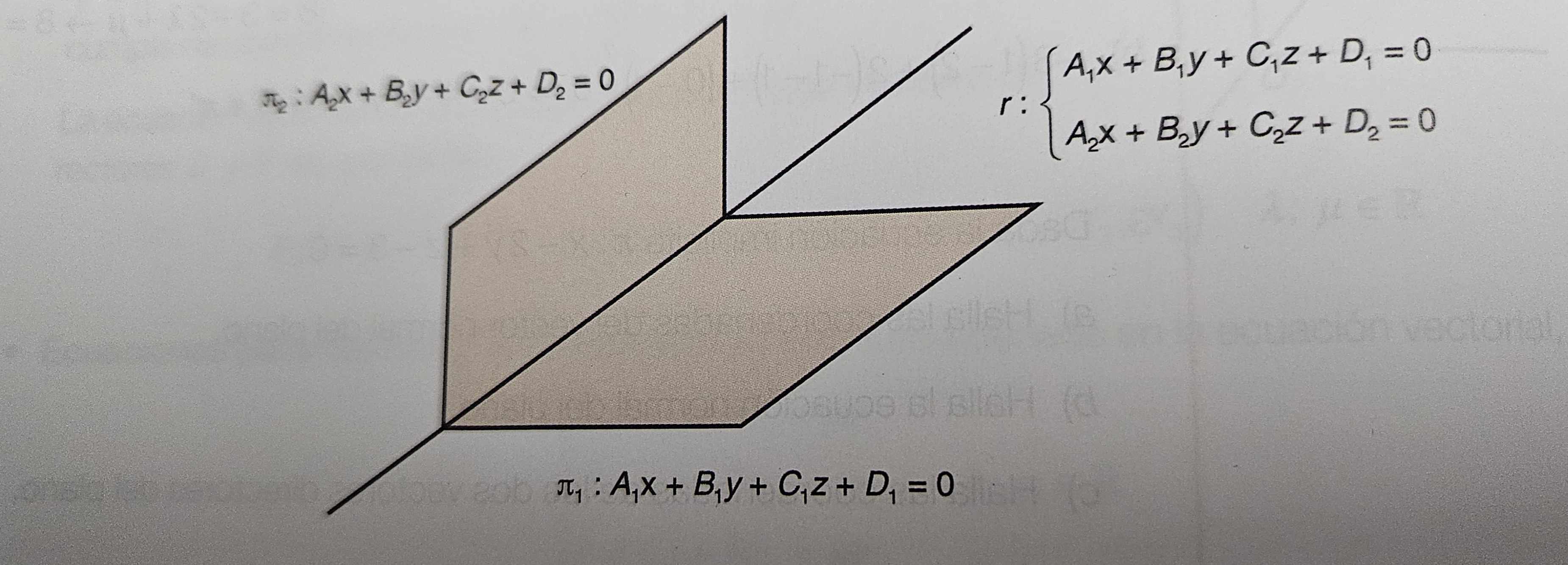 Ecuación implícita: O sistema: \(\left\{ \begin{array}{lcl} \lambda u_1 + \mu v_1 & = & x - x_0 \\ \lambda u_2 + \mu v_2 & = & y - y_0 \\ \lambda u_3 + \mu v_3 & = & z - z_0 \end{array} \right.\) Consideramos como as incógnitas \(\lambda, \mu\) e para estas o sistema debe ser compatible, é dicir, \(\text{rg } A = \text{rg } A^* = 2\) (temos dúas incógnitas). Polo que: \(\left|\begin{matrix} u_1 & v_1 & x - x_0 \\ u_2 & v_2 & y - y_0 \\ u_3 & v_3 & z - z_0 \end{matrix}\right| = 0\) Desenvolvendo teremos unha ecuación da seguinte forma: \[\pi: Ax + By + Cz + D = 0\] |