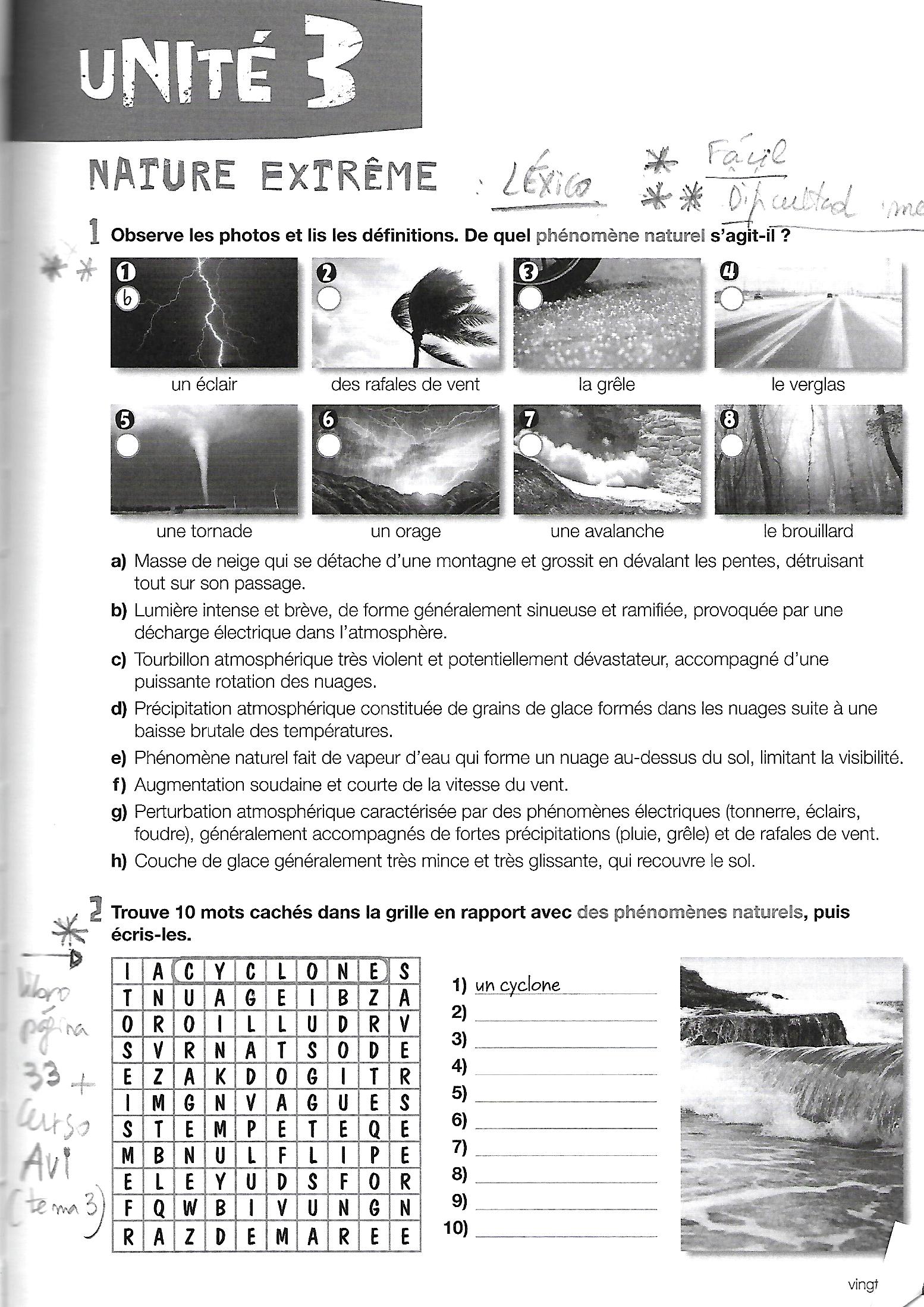 En el libro digital, podéis ir escuchando las actividades de la unidad 3, en la página 33 y 35 sobre el medioambiente y algunos fenómenos atmosféricos adversos. Se trata de una unidad interesante y nada difícil. Presenta el léxico de algunos fenómenos atmosféricos extremos, las profesiones del futuro, que puede ser muy interesante para el trabajo que tengo idea de pediros, relacionado con la pandemia que vivimos en estos momentos, pero buscando el aspecto esperanzador.