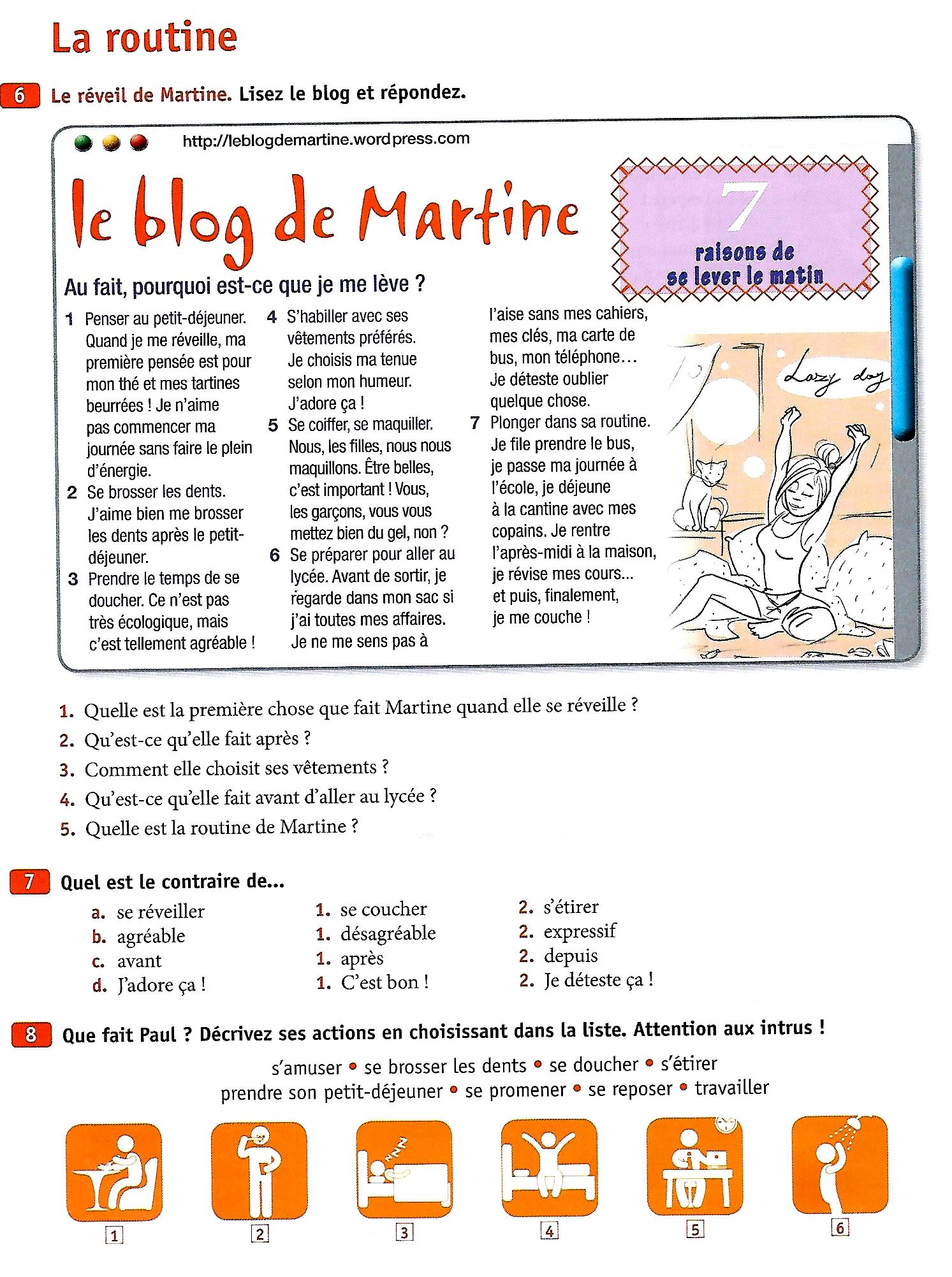 2- “Le blog de Martine”, livre page 64. Responder a las 5 preguntas + ejercicios 7 y 8. Verbes pronominaux ("verbos pronominales")