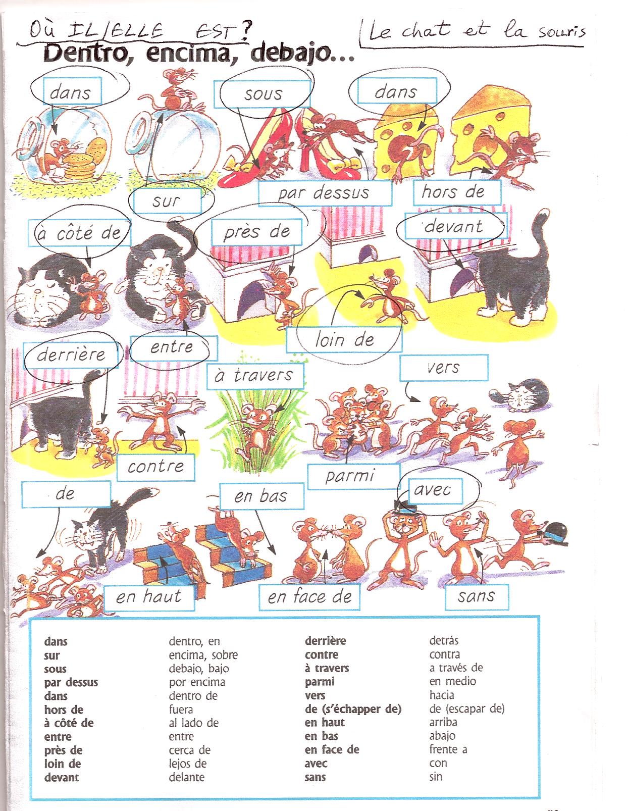 2- En el segundo ejercicio, con dos páginas, tenéis la descripción de una habitación con los nombres de cada parte ya traducido, pero que debéis ordenar. .En la segunda página, tenéis un dibujo del estudio y mesa de trabajo , hay también un pequeño recuadro con las preposiciones (tenéis que buscar su significado, ayudándoos del dibujo que os inserto en la página, aquí encima) y luego completar las frases con las preposiciones.