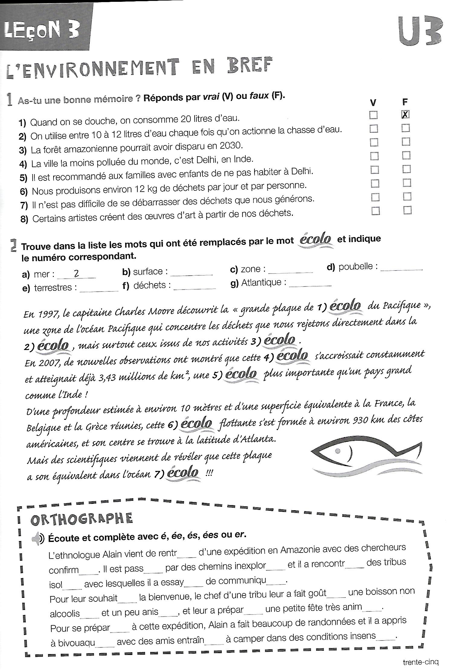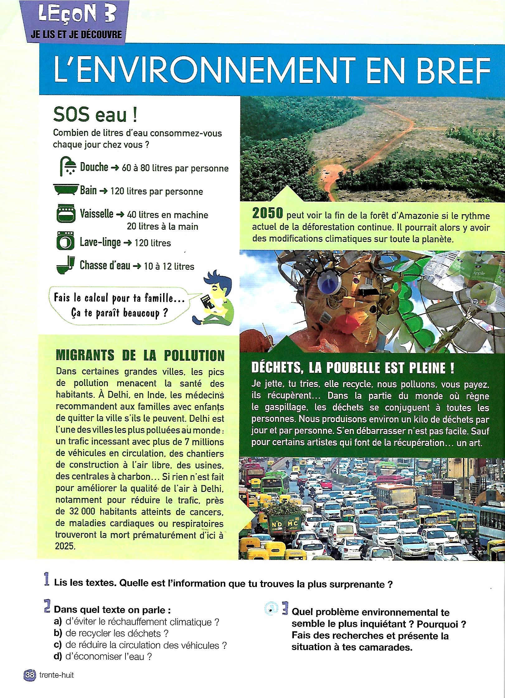 2. Lire et comprendre un texte: “L’environnement en bref”. Lisez les textes , répondez aux 3 questions de la page 38 de votre livre et faites les exercices 1, 2 et 3 du cahier d’exercices.