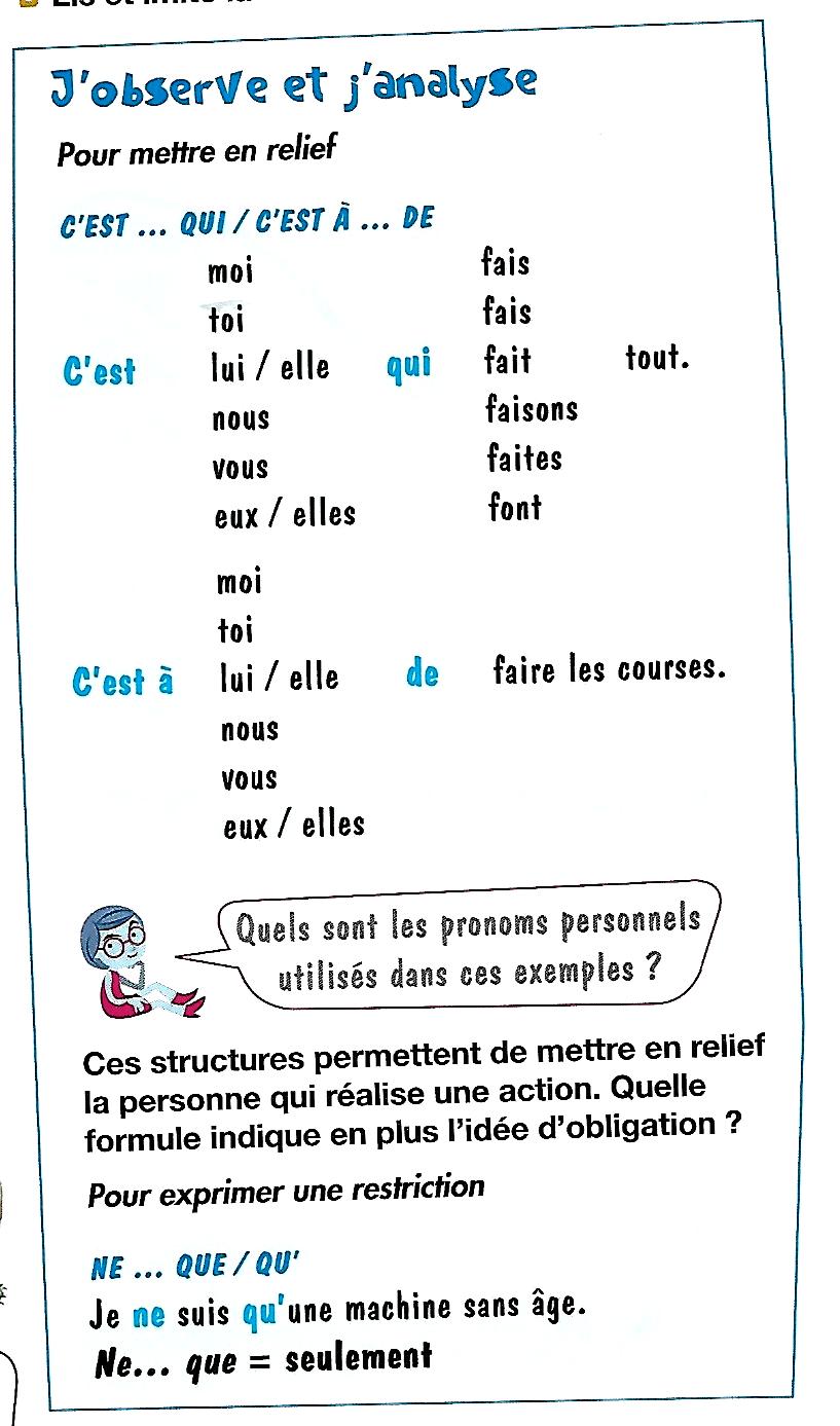 Y aquí os dejo la estructura que utiliza el pronombre personal tónico para insistir sobre un elemento de la frase, en este caso, el sujeto. Esta estructura, propia del francés, se llama "la mise en relief" (= "puesta en relieve, porque se puede resaltar cualquier elemento de la frase, excepto el verbo "). Aquí sólo vais a emplear la estructura que resalta el sujeto, como podéis observar en este cuadro que tenéis en el libro, en la página 45.