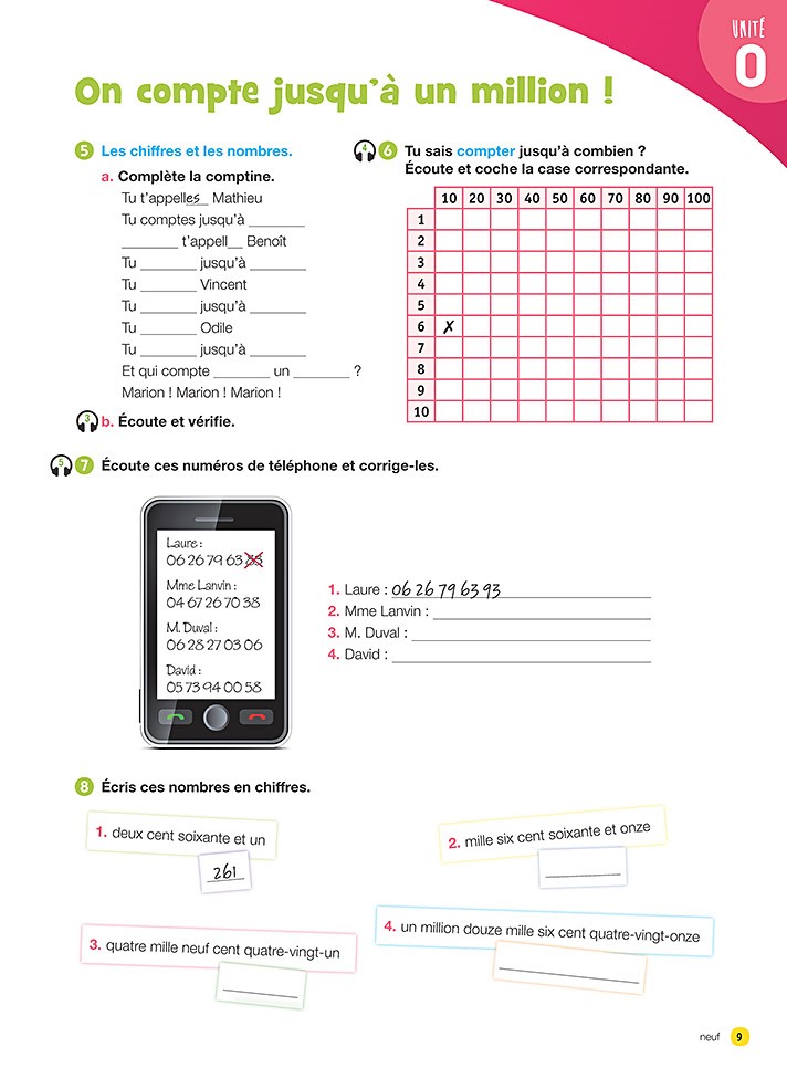 Exercice 7: "Écoute ces numéros de téléphone et corrige-les" ( piste 5 ) >>