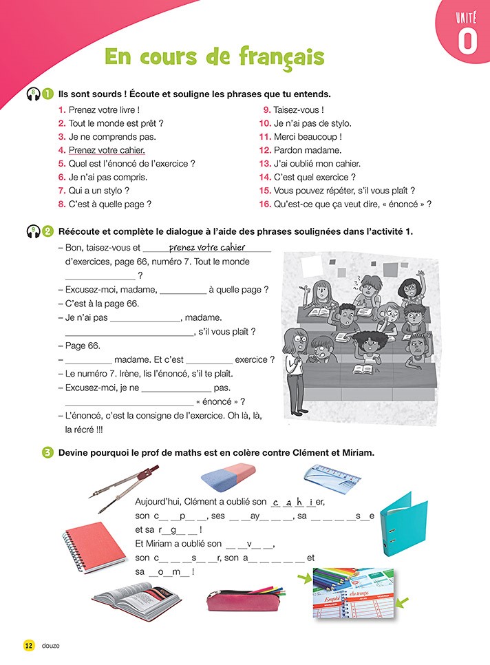 -Ils sont sourds ! Écoute et souligne les phrases que tu entends. – Bon, taisez-vous et prenez votre cahier d’exercices, page 66, numéro 7. Tout le monde est prêt ? – Excusez-moi, madame, c’est à quelle page ? – C’est à la page 66. – Je n’ai pas compris, madame. Vous pouvez répéter, s’il vous plaît ? – Page 66. – Merci, madame. Et c’est quel exercice ? – Le numéro 7. Irène, lis l’énoncé, s’il te plaît. – Excusez-moi, je ne comprends pas. Qu’est-ce que ça veut dire « énoncé » ? – L’énoncé, c’est la consigne de l’exercice. Oh là là, la récré !!!