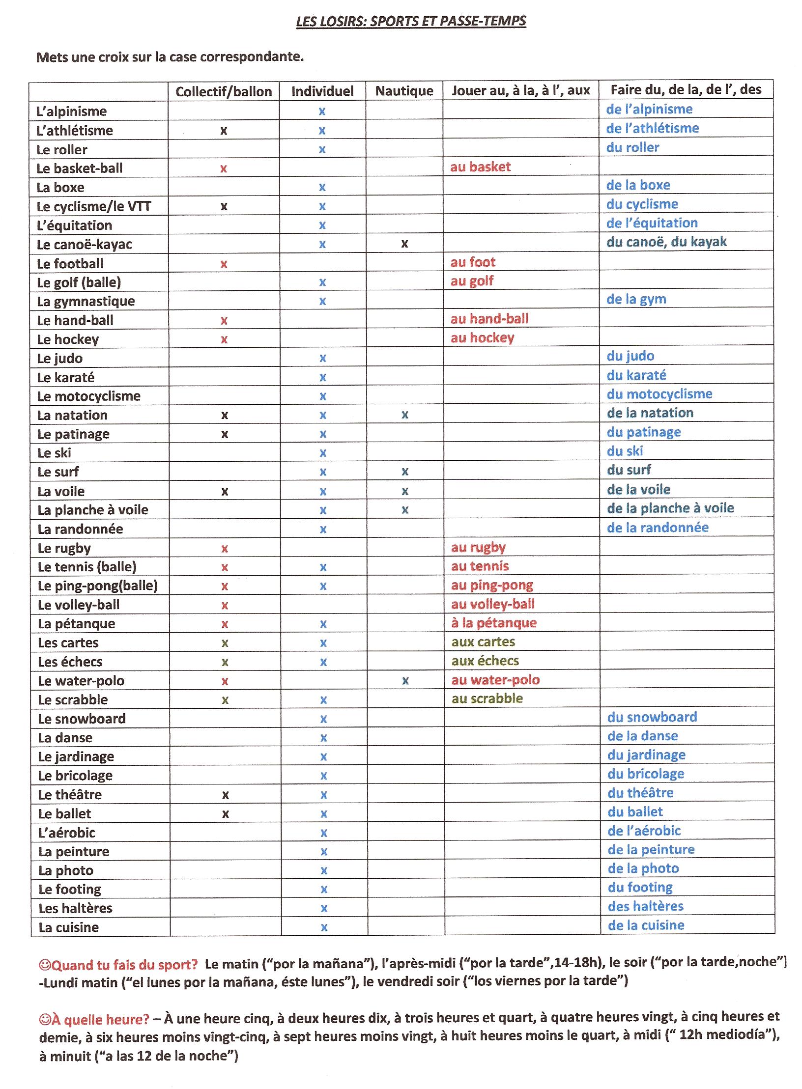 JOUER + SPORT DE BALLON EN ÉQUIPE au volley à la pétanque à l’élastique aux échecs JOUER + JEUX DE SOCIÉTÉ / D’AUTRES JEUX au cache-cache (« al escondite ») à la poupée ( « a las muñecas ») à l’épervier (« a la pita ») aux cartes, aux jeux-vidéo aux échecs ("al ajedrez") |