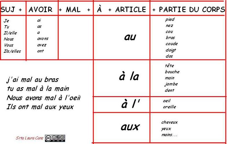 La expresión "Avoir mal à + parte del cuerpo" para expresar lo que nos duele.