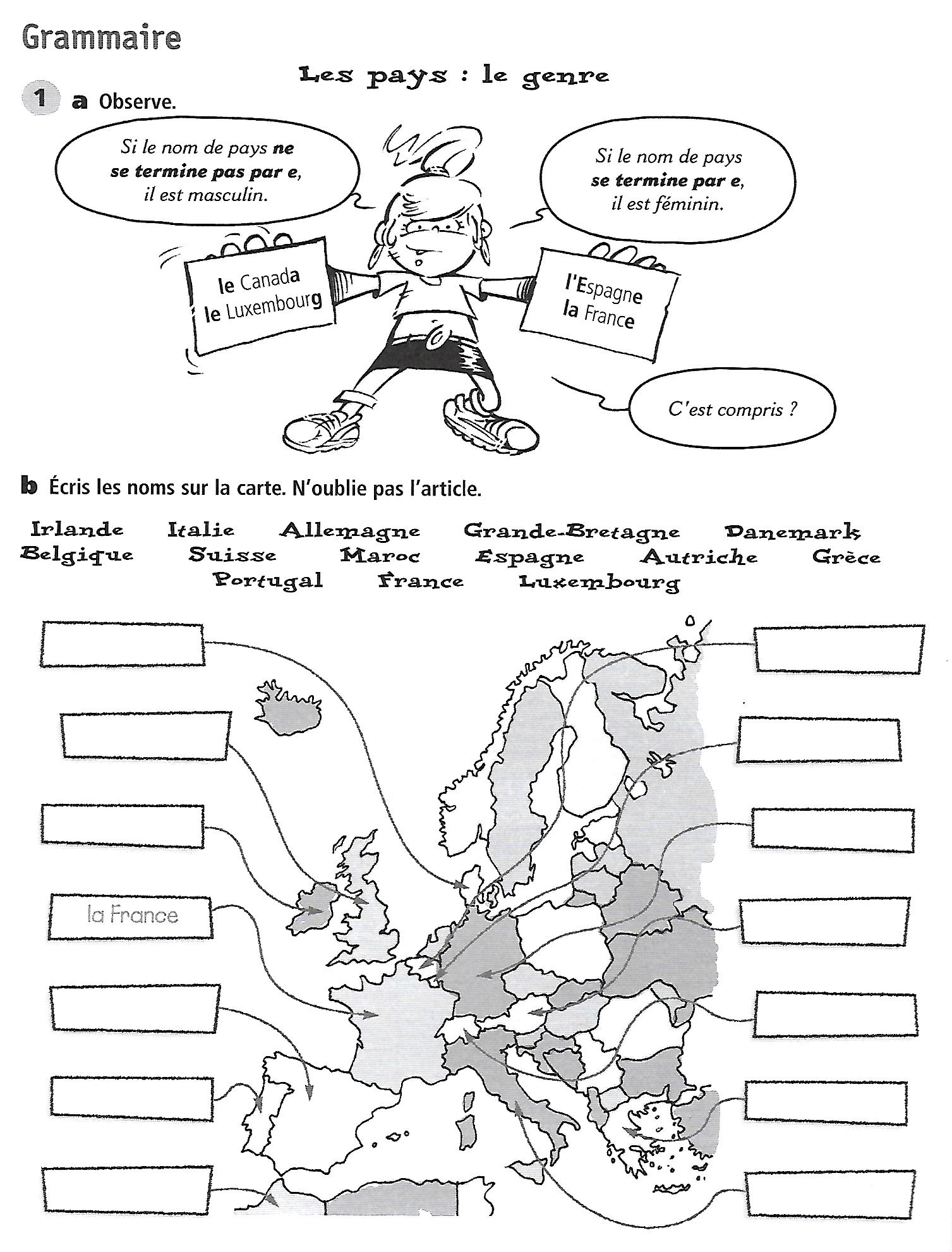 Aquí os dejo un cuadro y un mapa de Europa para aprender los géneros y nombres de los países en francés, y situarlos bien en el mapa mudo.
