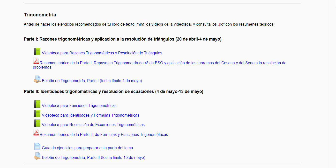 Lo adecuado para trabajar con eficiencia es ver los vídeos primero, después leer el documento .pdf del Resumen Teórico de la Parte II, asegurándoos de que entendéis bien cómo deducir rápidamente las fórmulas trigonométricas, y después hacer los ejercicios recomendados en la Guía de ejercicios para preparar esta parte del tema. Si después de hacer estos ejercicios aún necesitáis practicar más, tenéis otro listado de ejercicicios recomendados en la sección Tercera Evaluación.