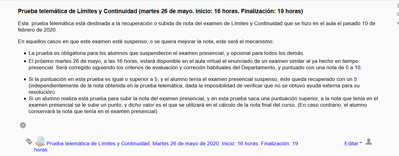 Instrucciones para la prueba telemática del 26 de mayor de 2020 by Silvia Fernández Carballo - Friday, 8 May 2020, 4:28 PM Number of replies: 0 Buenas tardes. Ya tenéis en el aula virtual las instrucciones para la prueba telemática de Límites y Continuidad. Permalink