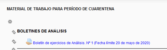 Tenéis disponible en el aula virtual el enunciado del Boletín de Análisis número 1. El plazo de entrega es el 20 de mayo.