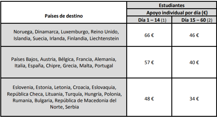 En función do país de destino, da mobilidade e da duración da estancia, o apoio individual correspóndese coas cuantías reflexadas nas táboas seguintes: