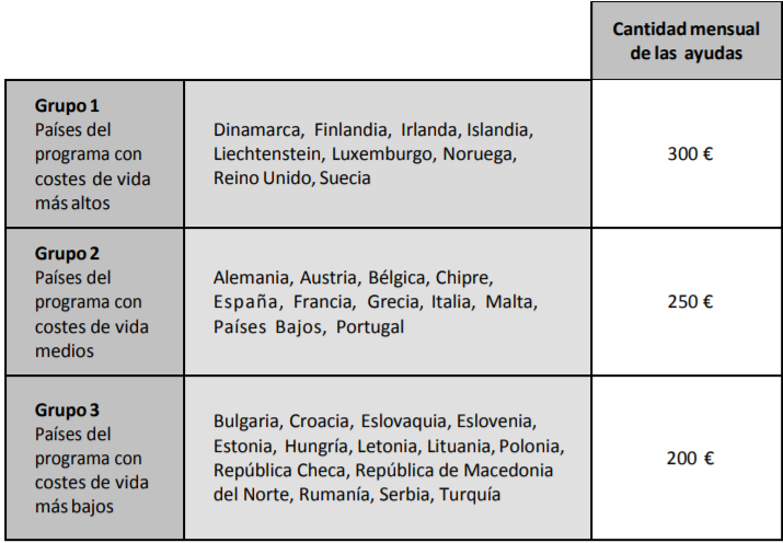 O importe das axudas dependerá do nivel de vida do país de destino, segundo os tres grupos que se describen a continuación (incrementadas en 100€ por mes ao ser unha mobilidade para realización de prácticas):