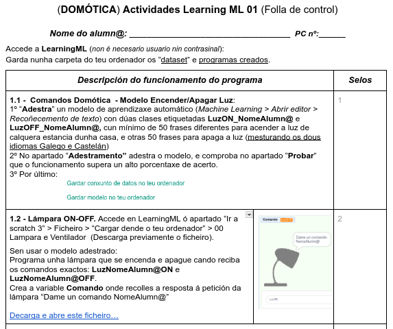 Realiza os exercicios da ficha de Machine Learning for Kids durante as sesións de clase dedicadas (Tempo limitado de sesións)