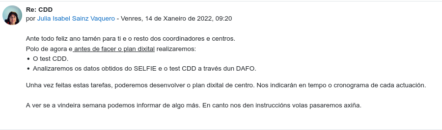 Parece que o seguinte paso é facer o test de CDD (Competencia Dixital Docente). Supoño que xa nos indicarán cando estea dispoñible, xa que o terán que elaborar ou os ADIX ou a Consellería, e facelo accesible a través dalgunha plataforma para todo o profesorado. Será algo similar ao test IKANOS do País Vasco ou ao de Séneca en Andalucía.