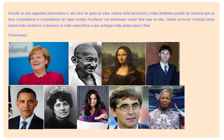 Ola a tod@s, déixovos aquí una foto na que aparece a tarefa que tendes que facer. En sesión anteriores traballáramos con diferentes tipos de textos. Pois ben, aquí debedes facer una descrición (texto descritivo) dunha desas persoaxes que vos aparecen no documento. Picade donde pon "Persoaxes" e xa vos debería abrir.