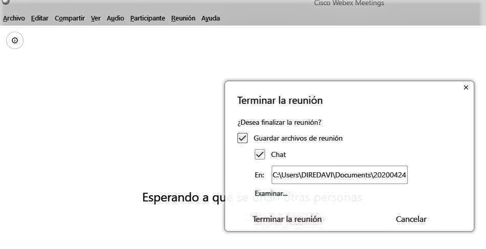 Al finalizar una reunión, cuando vamos a salir de ella, Webex nos ofrece guardar los archivos de la reunión. Es interesante guardarlos, ya que esto nos permite tener una idea sobre cómo transcurrió la clase.