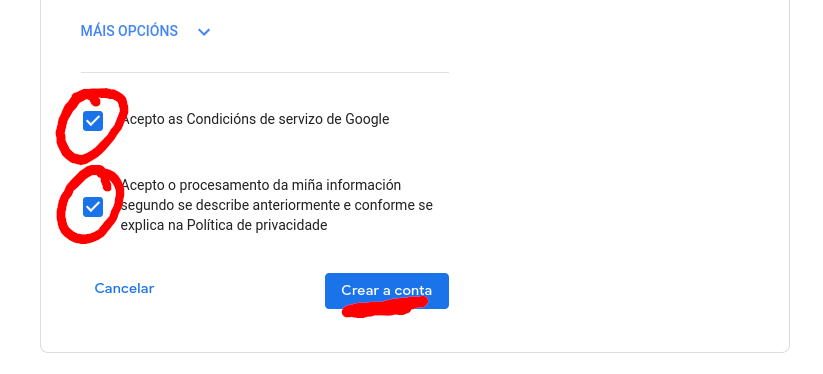 Na seguinte páxina aparécenos as condicións de uso desta conta. Abaixo de todo hai dous cadros para marcar que temos que aceptar para poder continuar e crear a conta.