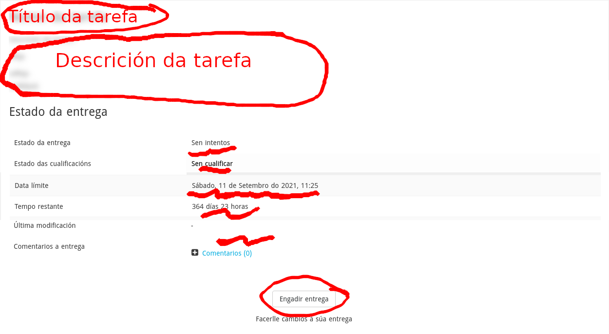 Cando entramos na tarefa podemos ver o seu título e a descricción da mesma. Ademais observamos información sobre o estado da tarefa entre o que se inclúe a data límite de finalización da tarefa e canto tempo nos queda para realizala. Para enviarlle un ficheiro ao profesor/a prememos en "Engadir entrega".