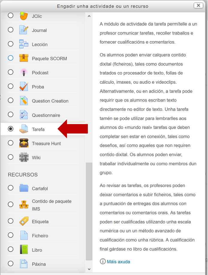 Escollemos Tarefa dentro das actividades: