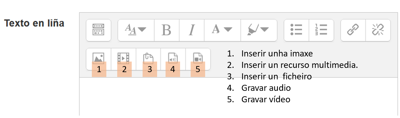 - Texto en liña. O alumnado debe escribir un texto directamente no editor de Moodle para a súa entrega. O editor de texto de Moodle permite non só escribir unha resposta, pódese engadir unha imaxe, un arquivo,... ou gravar audio ou vídeo.