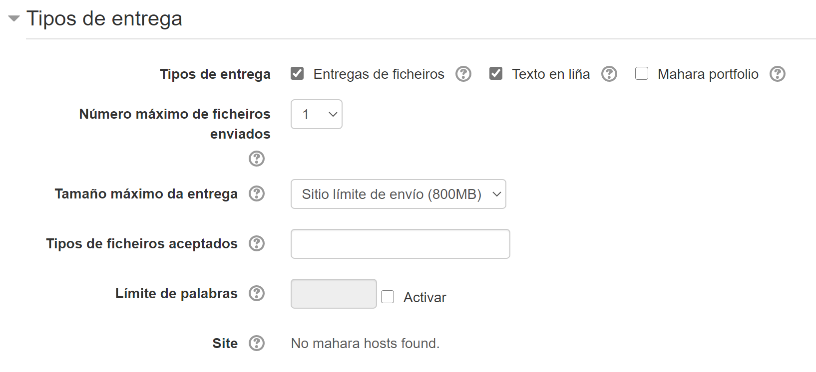 - Entregas de ficheiros: Os estudantes deberán enviar un ou máis arquivos como entrega.