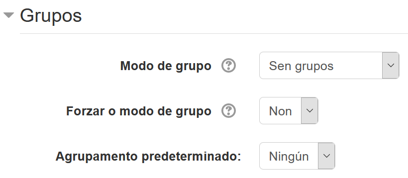 Na configuración do curso (Administración / Administración do curso / Editar a configuración), no apartado Grupos aparecen as opcións dispoñibles: