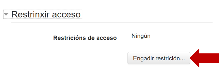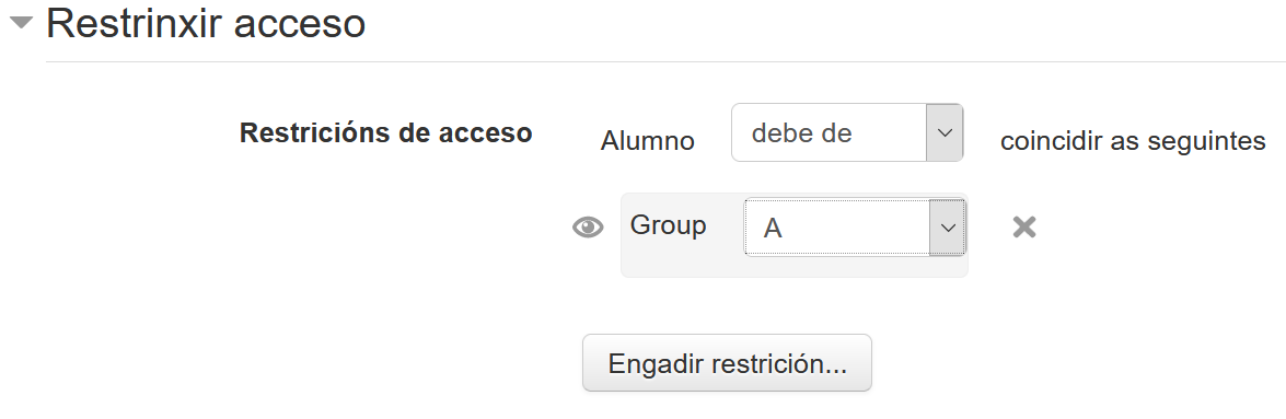 Podemos restrinxir o acceso a un recurso ou a unha actividade a un só grupo en Restrinxir acceso. É un dos apartados desplegables que aparecen ao configurar un recurso ou unha actividade: