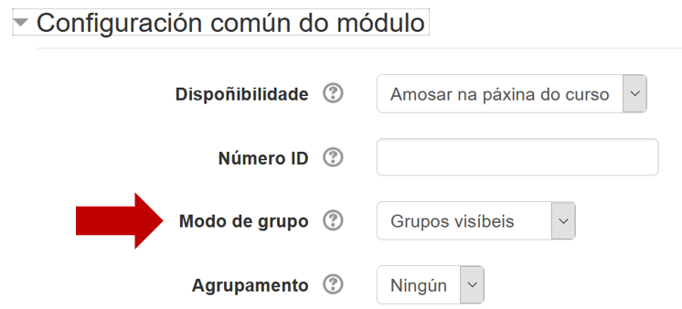 Se mantemos a opción NON, poderemos escoller en que actividade queremos activar o modo grupo (en Axustes comúns do módulo correspondente).