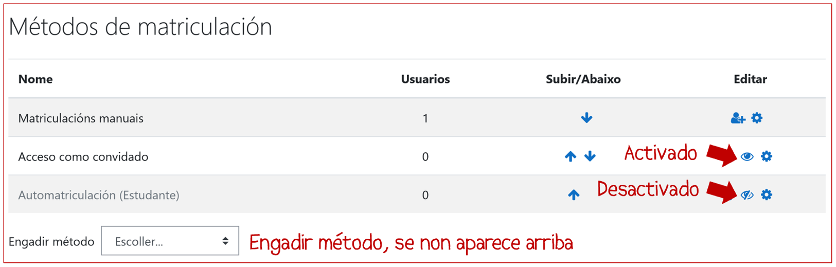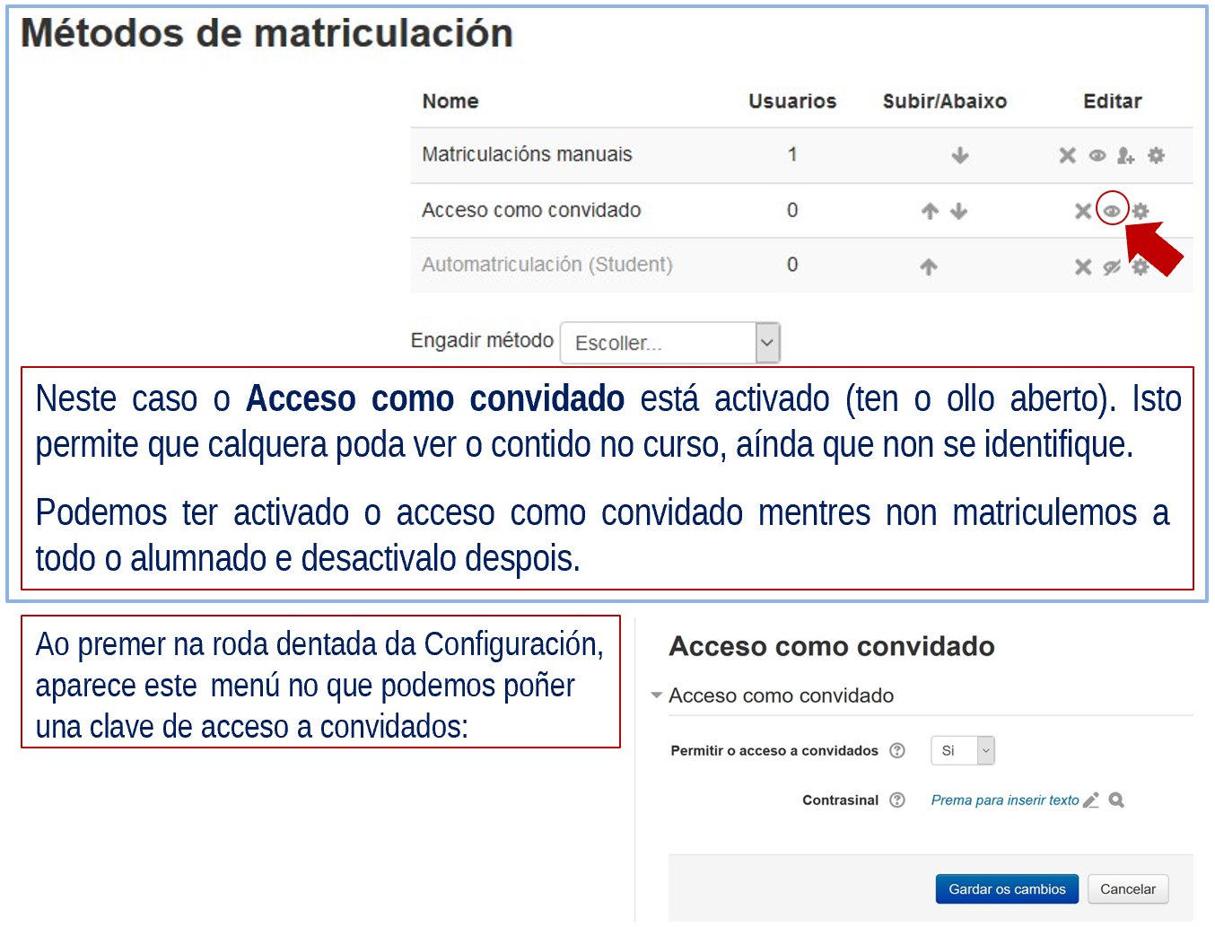 Hai que ter o curso aberto a convidados mentres se podan automatricular. Unha vez rematado o proceso, poderemos desactivar o Acceso como convidado.