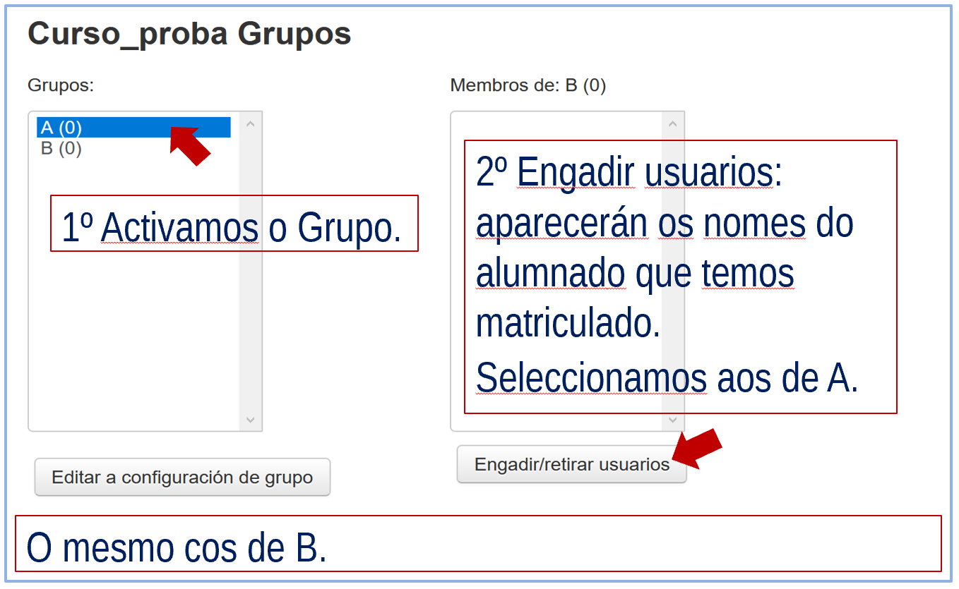 Se temos dous grupos dun mesmo curso (A e B, por exemplo), non é necesario crear (e manter) dous cursos. Basta crear un curso con dous grupos. Ao usar grupos pódelles aparecer recursos diferentes a cada grupo ou en diferentes momentos.