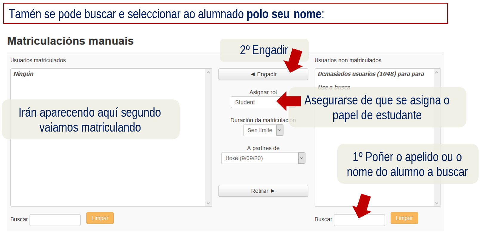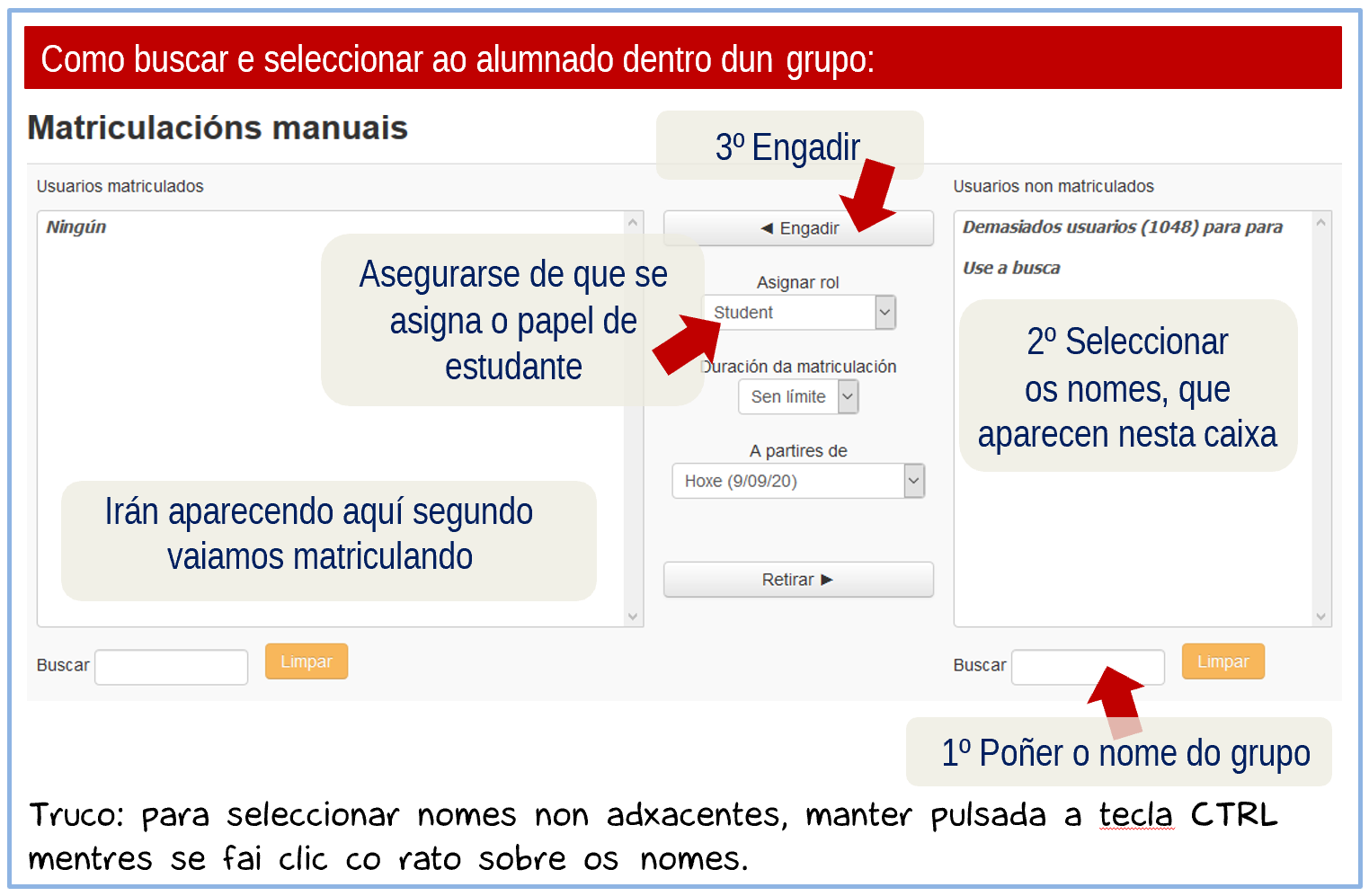 Para matricular ao alumnado, poñemos o nome do grupo (ver aquí as claves dos nomes dos grupos) na caixa de busca. Seleccionamos aos nosos alumnos: todos ou só algún. E os engadimos. Convén asegurarse de que lles asignamos o rol de Estudante (é o que sae por defecto).