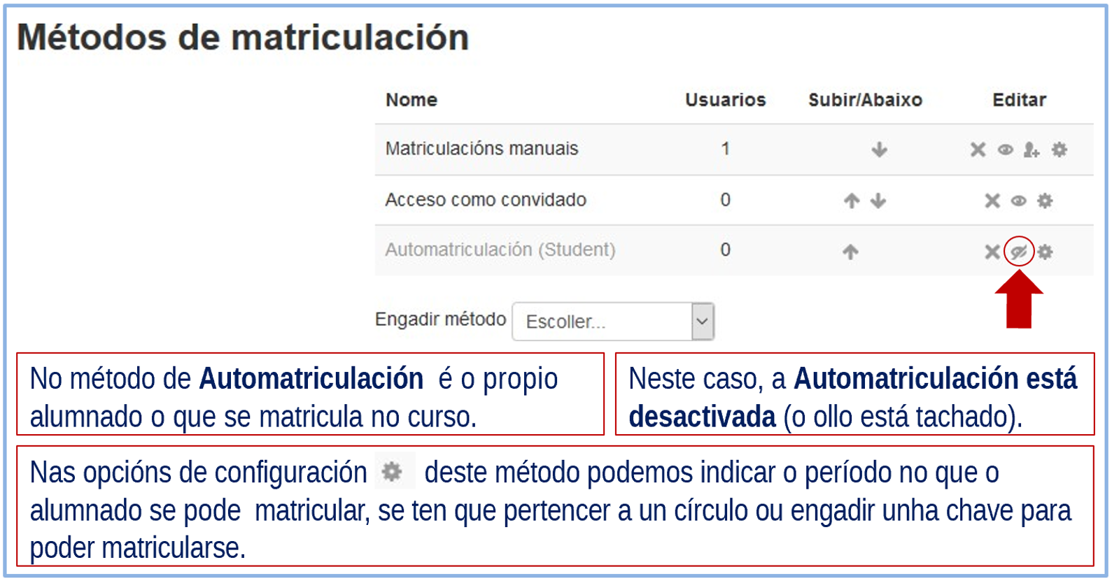 Hai que ter o curso aberto a convidados mentres se podan automatricular. Unha vez rematado o proceso, poderemos desactivar o Acceso como convidado.