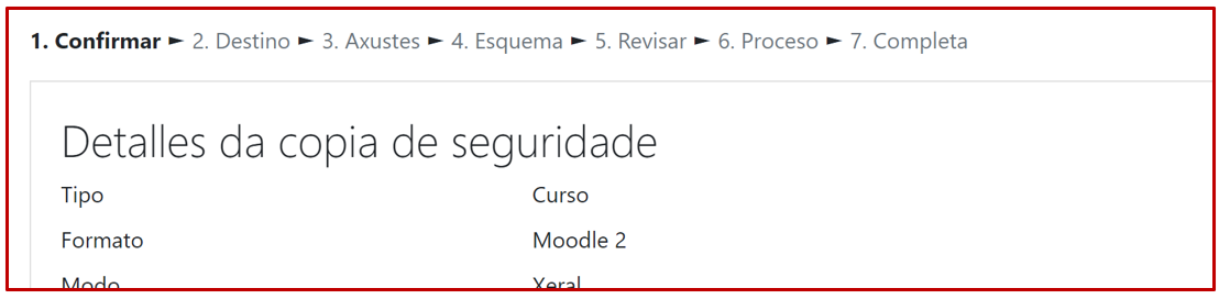 - Detalles do curso: Nome curto e identificador do curso contido na copia. O identificador non se reproducirá no destino, a non ser que se trate do mesmo curso na mesma aula virtual.