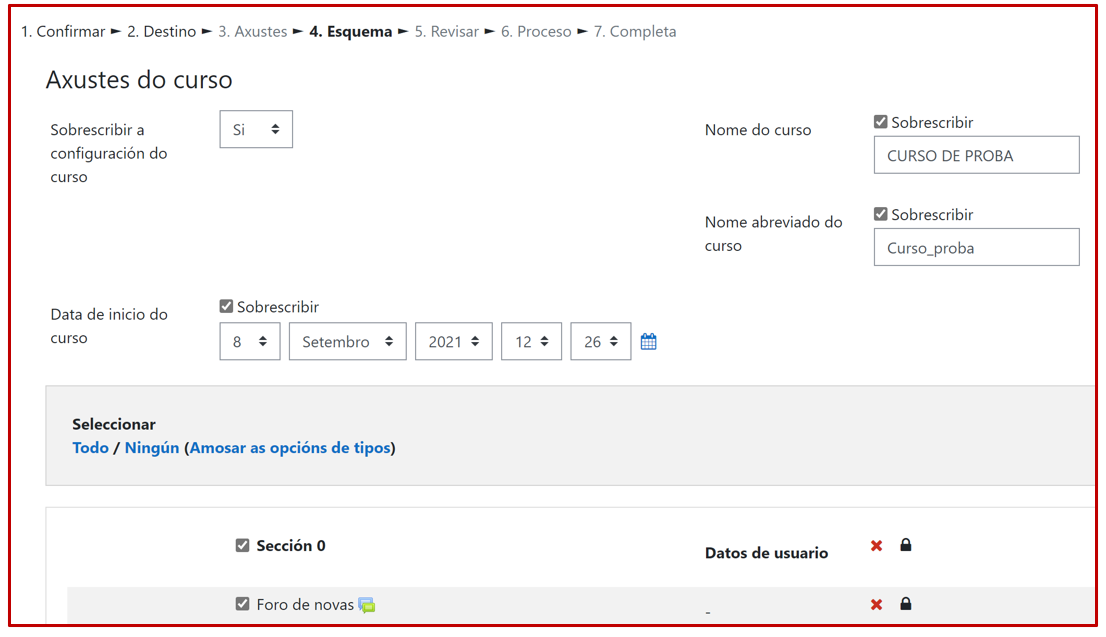 en Axustes do curso poderemos cambiar a configuración do curso, como actualizar a data de inicio.