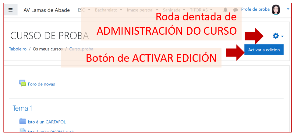 Ao crear un curso, hai que configuralo. Pero a configuración pódese cambiar en calquera momento. Na roda dentada arriba á dereita está a Administración do curso, Editar os axustes: