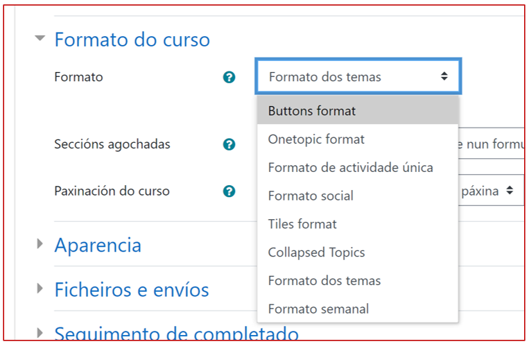 En EDITAR OS AXUSTES / FORMATO pódese escoller a forma de presentar o curso:
