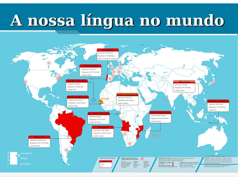 Aquí tedes o mapa da lusofonía (ao que tamén poderíamos engadir o galego dada a súa semellanza co portugués).