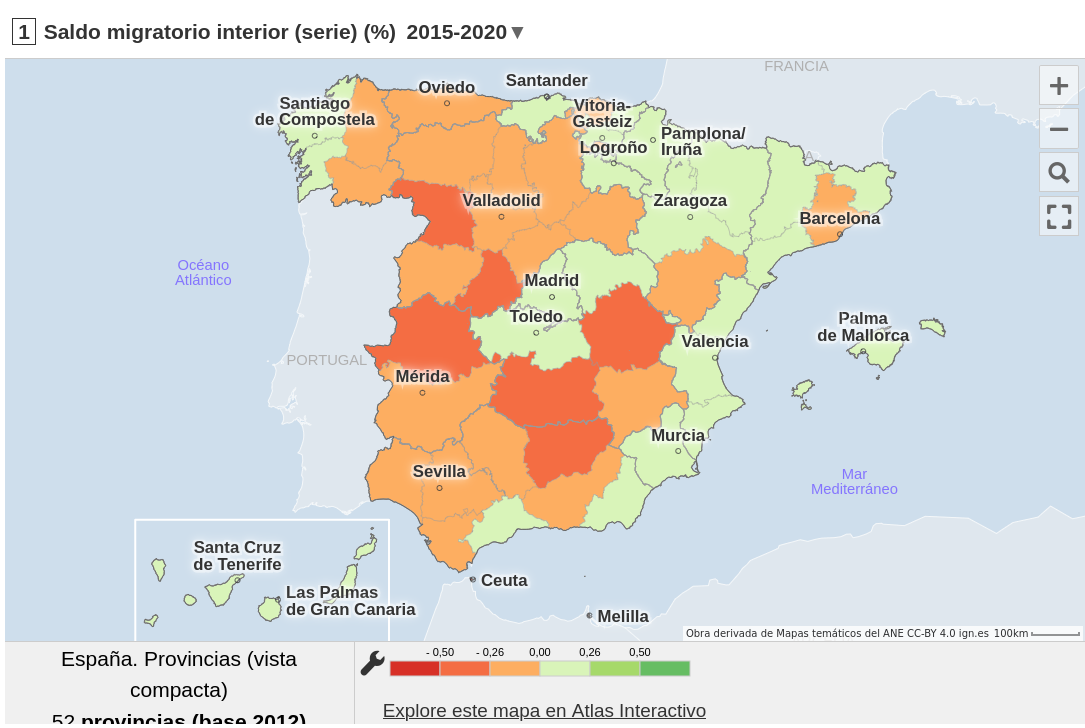 As cores permiten diferenciar claramente aquelas provincias con valores negativos (apreciándose un maior decrecemento poboacional na parte setentrional, unha gran parte de España) e valores positivos (fundamentalmente na parte meridional e en provincias como Madrid e Illes Balears).