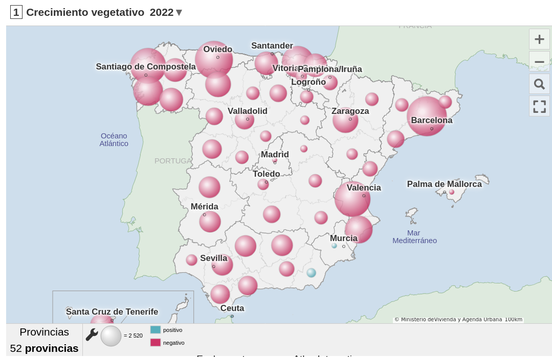 O seguinte mapa permite ver o crecemento ou decrecemento da poboación derivado da diferenza entre natalidade e mortalidade: