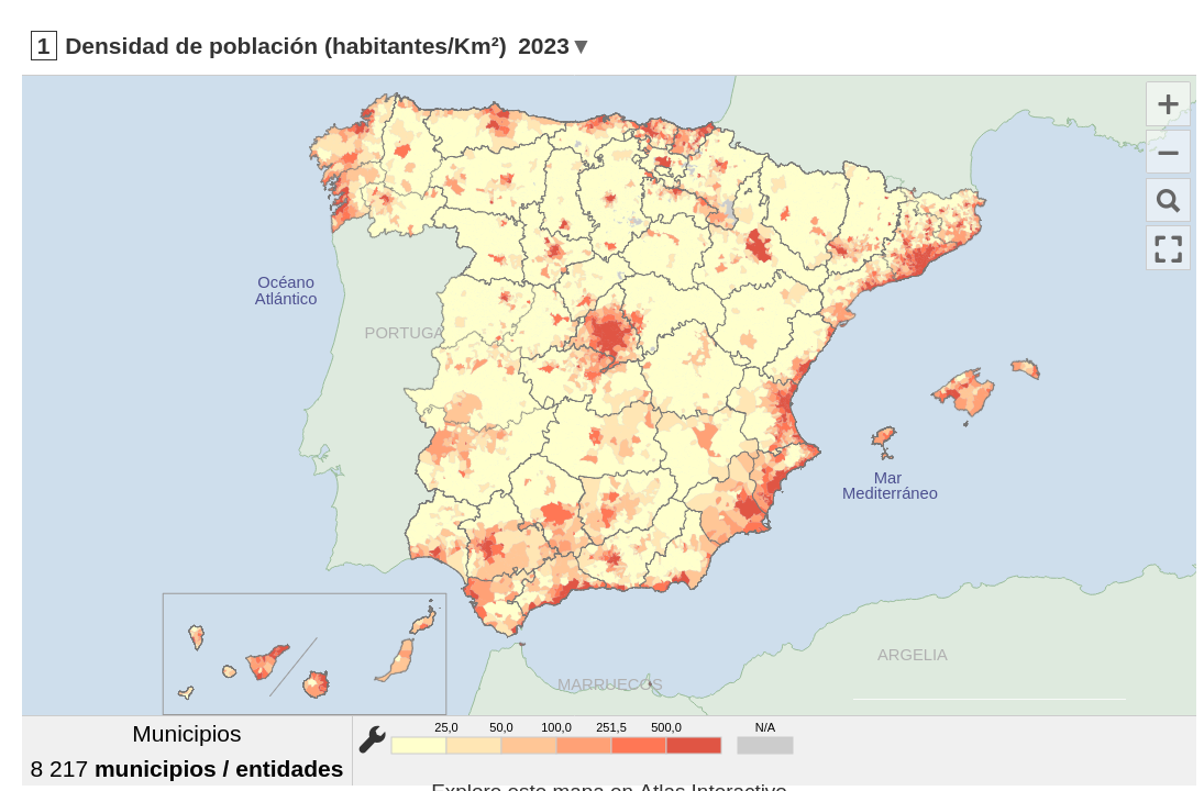 O seguinte mapa amosa a densidade de poboaciónen España por municipios