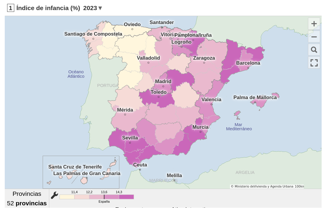 Os seguintes mapas representan o índice de infancia (poboación menor de 15 anos por cada 100 habitantes) e o índice de vellez (poboación maior de 65 anos por cada 100 habitantes) Preme sobre cada un para acceder ás súas posibilidades interactivas:![]() |