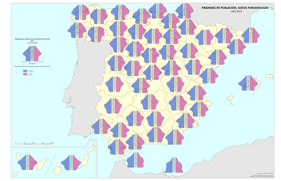 No seguinte mapa podemos ver as pirámides demográficas por provincias, referidas ao ano 2019