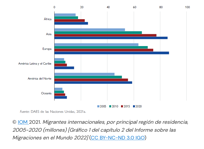 Atendendo á poboación de migrantes internacionais por rexións das Nacións Unidas, destaca Europa como principal destino. Isto pódese comprobar no seguinte gráfico, que mostra o número de migrantes internacionais que residen nas distintas rexións entre os anos 2005 e 2020.