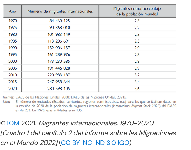 Na táboa de datos obsérvase o importante crecemento no número de migrantes internacionais, que en 50 anos se multiplicou aproximadamente por 3,32. Porén, tendo en conta o crecemento da poboación, a porcentaxe de migrantes con respecto á poboación mundial só pasou do 2,3 % ao 3,6 %, o que constitúe unha minoría dentro da poboación total. En xeral, a maioría das persoas que migran non traspasa as fronteiras internacionais (é dicir, permanecen no seu país de nacemento). (Informe sobre as Migracións no Mundo, 2022).