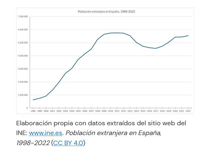 O crecemento do número de estranxeiros en España nas últimas décadas foi espectacular. Segundo datos do INE, en 1998 residían en España 637 085 estranxeiros, o que supoñía un 1,60 % da poboación total do país. Dez anos despois, en 2008, a cifra ascendía a 5 268 762 estranxeiros, representando o 11,41 % da poboación total española. Os últimos datos de 2022 indican que en España vivían 47 475 420 persoas, das cales 5 542 932 eran estranxeiras, o que supón un 11,68 % do total.