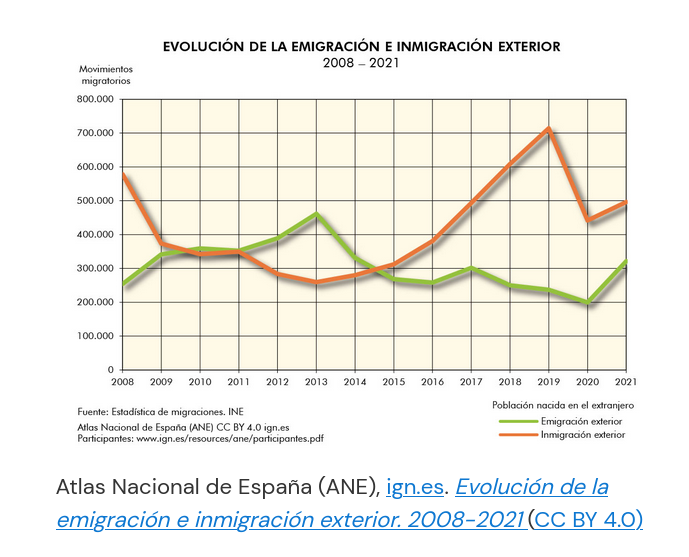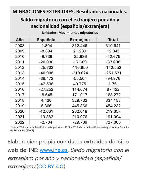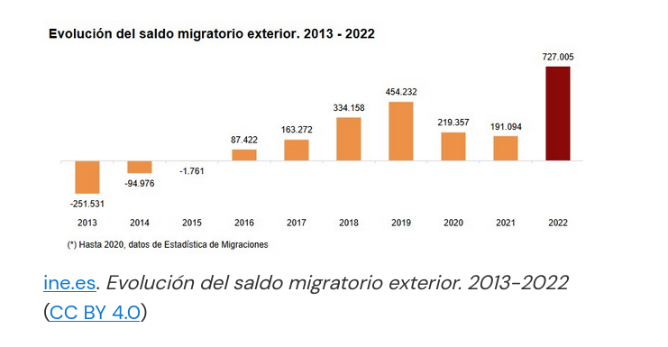 Como se pode observar na seguinte táboa, en 2022 o saldo migratorio dos estranxeiros co exterior creceu ata as 729 709 persoas (é dicir, houbo un gran número de entradas de persoas con nacionalidade estranxeira). Pola contra, o saldo migratorio dos españois co exterior foi lixeiramente negativo (-2704 persoas), o que significa que houbo un maior número de persoas con nacionalidade española que abandonaron o país en relación aos que entraron. (INE, 2022)