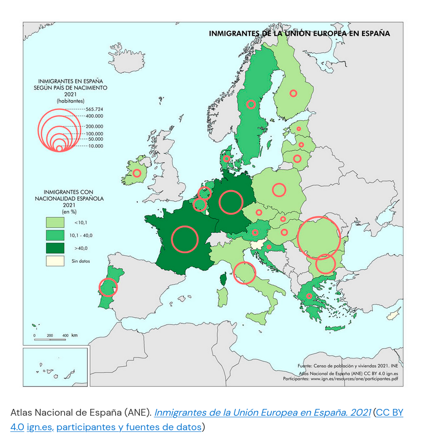 Con respecto á Unión Europea (UE), en España hai uns 1,5 millóns de residentes. Ademais da procedencia maioritaria de romanos, cabe destacar aquelas persoas que proveñen de Francia, Alemaña, Italia e Bulgaria.