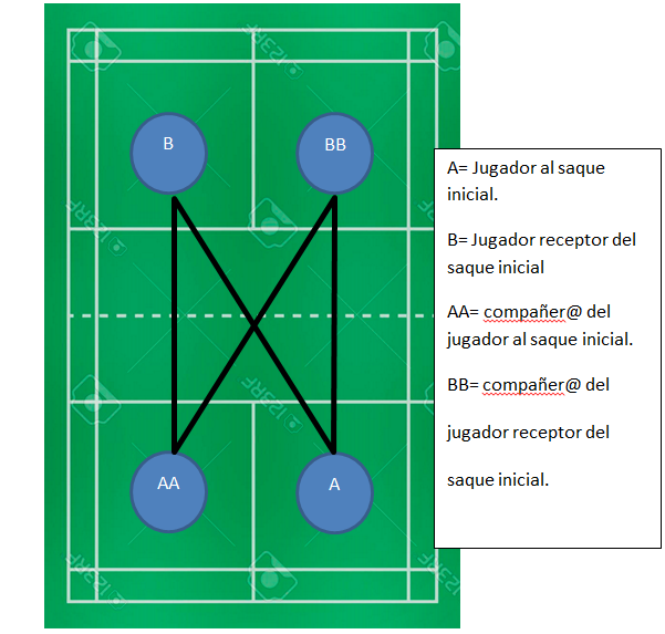 4º. saca el compañero del receptor del saque inicial, que mantendrá el saque hasta que la pareja contraria gane el punto y recupere saque.
