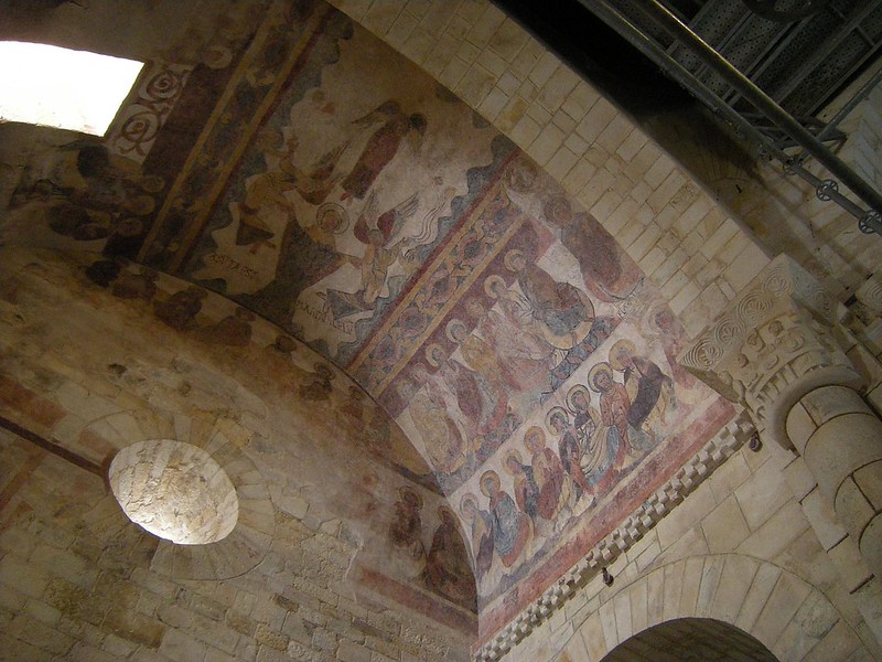Un primeiro salto e chegaredes ao Primeiro Románico, entre século once (XI) e comezos do século doce (XII). Desenvólvese principalmente no norte de Italia, desde onde se estenderá polo sur de Francia e norte de Cataluña e Aragón. É un estilo aínda en formación, que maioritariamente se desenvolve na arquitectura, empregando materiais diversos, ladrillo e mampostería. Buscan crear espazos cubertos con bóvedas e empregar columnas con capiteis. Como elemento decorativo distintivo incorporan as chamadas bandas lombardas, coma neste exemplo. Observade tamén que os muros están construídos con pedras de tamaño irregular, a mampostería.
